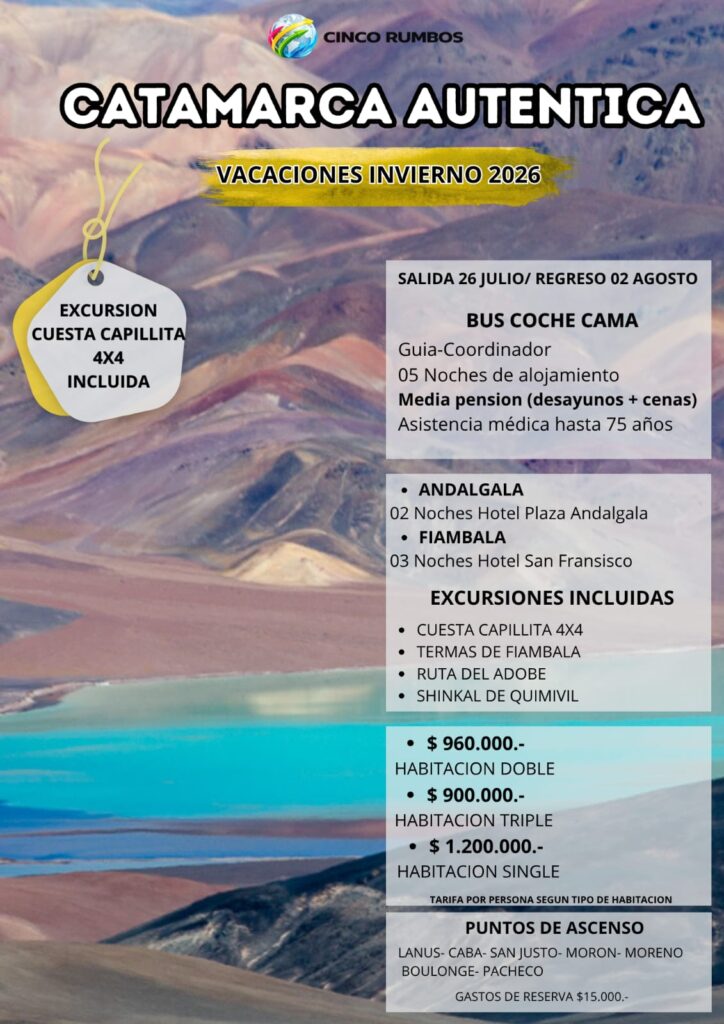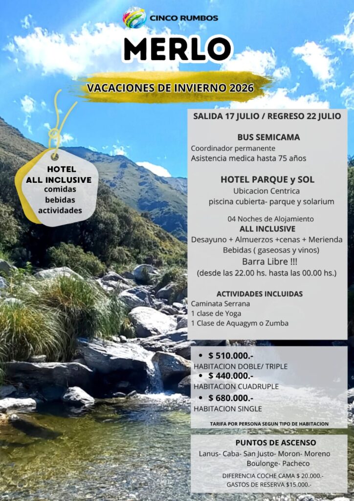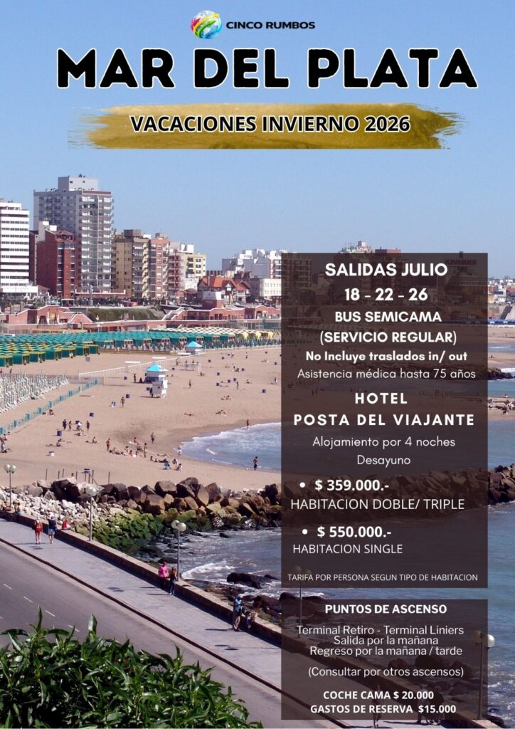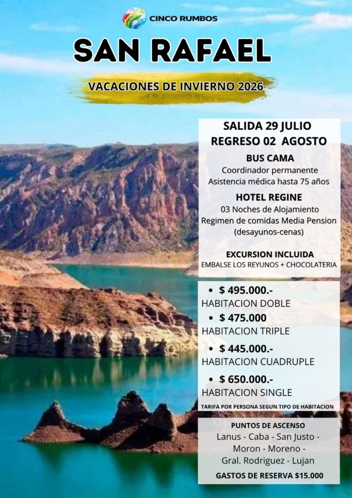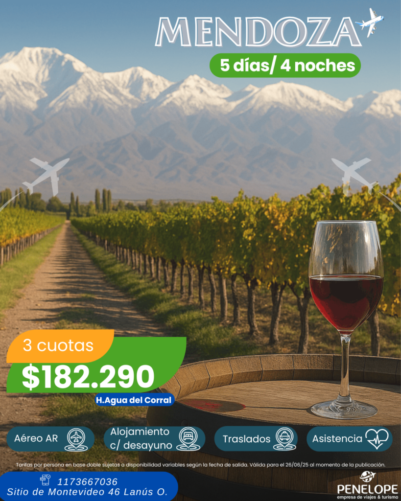 MENDOZA 23/07/2026🛫 Aéreo AEROLINEAS ARGENTINAS con equipaje en bodega🏨 04 días/03 noches☕ Desayuno🚌 Traslados in/out🏥 Universal Assistance (hasta 70 años) 🏨 HOTEL AGUA DEL CORRAL...