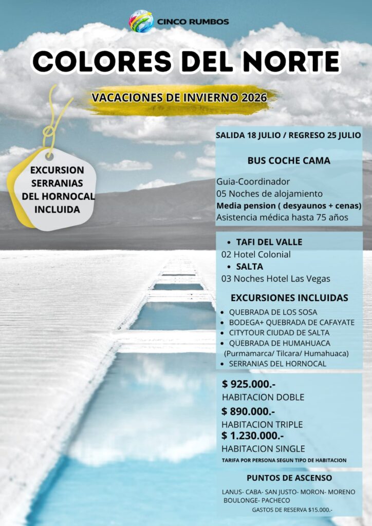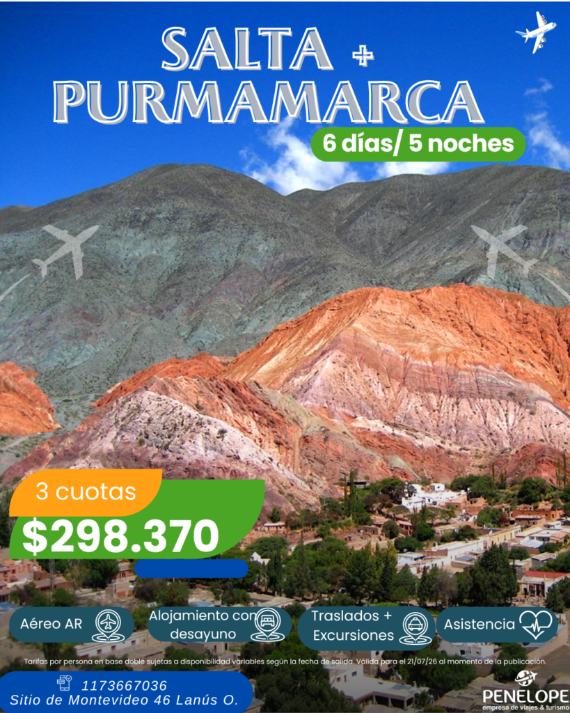 SALTA + PURMAMARCA 21/07/2026🛫 Aéreo AEROLINEAS ARGENTINAS con equipaje en bodega🏨 06 días/05 noches☕ Desayuno🚌 Traslados in/out🏥 Universal Assistance 🏨 HOTEL DEL TREN + Hosteria...