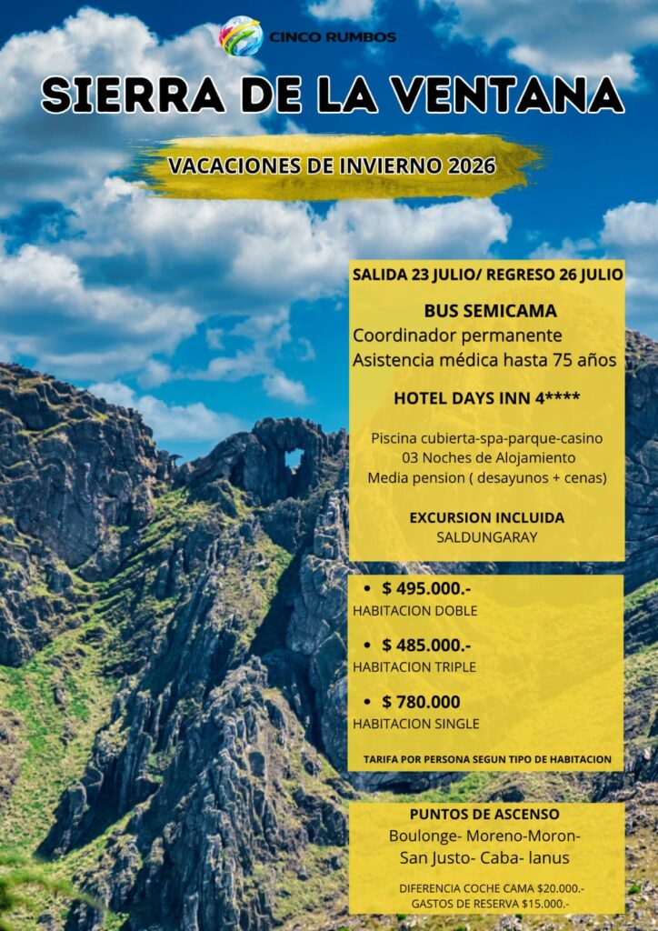 SIERRA DE LA VENTANA 13/05/2026📆 04 días – 03 noches🚌 Bus Semicama ida y vuelta (Chárter Propio) – Guía Coordinador permanente🍽️ Media Pensión🏥 Incluye asistencia...