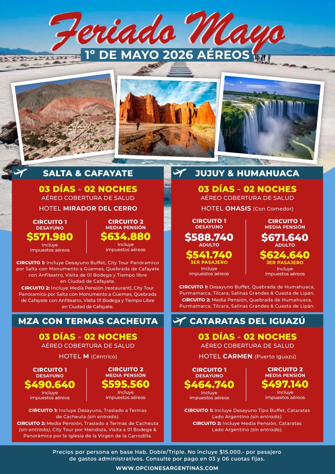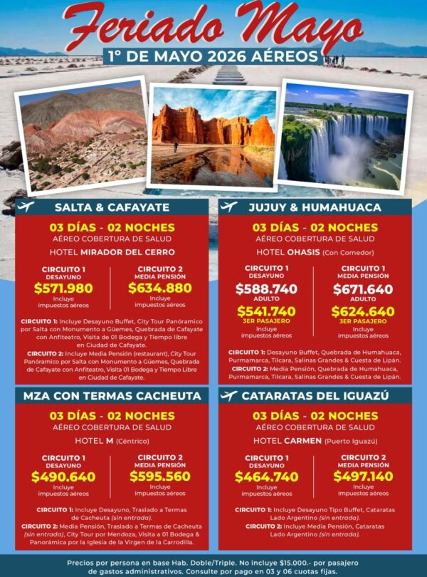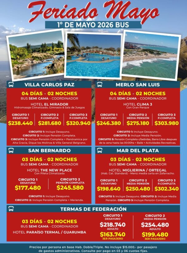 Ingresá en el enlace para ver la información de cada destino: https://opcionesargentinas.com/tag/feriado-del-1%C2%BA-de-mayo