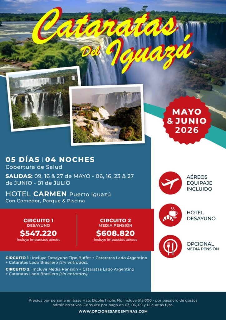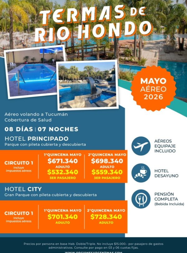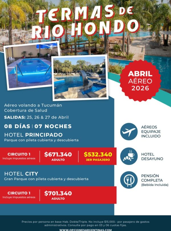 ☕ Incluye Pensión Completa Bebidas libres Incluidas en las comidas: Vino – Cerveza – Agua con y sin gas – Gaseosa + 13 o 14 comidas, según horario de vuelo